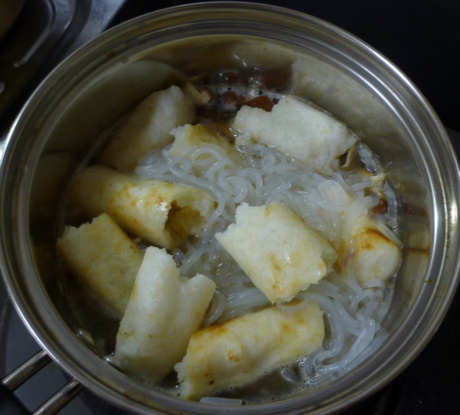 中:きりたんぽ入れます。だいたい1本を3切くらいにします。私の場合は男の料理っぽく手で割り入れました。切り口がギザギザになってスープがしみやすいからです。包丁を使うときは、少し斜めに切ると、スープがしみこみやすいし見栄えも良いです